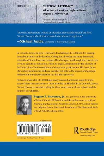 In Critical Literacy, Eugene F. Provenzo Jr. challenges E. D. Hirsch's assumptions about culture and education. Calling for a broader and more democratic vision than Hirsch, Provenzo critiques Hirsch's legacy up through the current conservative educational agenda for education which, he argues, denies not only the United States' diversity, but its democratic traditions of democratic participation. His book shows why critical faculties and skills of students are essential not only to the success of individual students but to their participation in a healthy democracy.