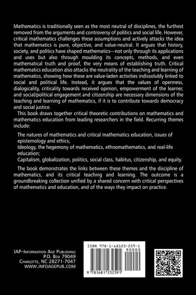 A volume in Cognition, Equity, & Society: International Perspectives Series Editors: Bharath Sriraman, University of Montana and Lyn English, Queensland University of Technology Mathematics is traditionally seen as the most neutral of disciplines, the furthest removed from the arguments and controversy of politics and social life. However, critical mathematics challenges these assumptions and actively attacks the idea that mathematics is pure, objective, and value¿neutral. It argues that history, society, and politics have shaped mathematics-not only through its applications and uses but also through molding its concepts, methods, and even mathematical truth and proof, the very means of establishing truth. Critical mathematics education also attacks the neutrality of the teaching and learning of mathematics, showing how these are value¿laden activities indissolubly linked to social and political life. Instead, it argues that the values of openness, dialogicality, criticality towards received opinion, empowerment of the learner, and social/political engagement and citizenship are necessary dimensions of the teaching and learning of mathematics, if it is to contribute towards democracy and social justice. This book draws together critical theoretic contributions on mathematics and mathematics education from leading researchers in the field. Recurring themes include: The natures of mathematics and critical mathematics education, issues of epistemology and ethics; Ideology, the hegemony of mathematics, ethnomathematics, and real¿life education; Capitalism, globalization, politics, social class, habitus, citizenship and equity. The book demonstrates the links between these themes and the discipline of mathematics, and its critical teaching and learning. The outcome is a groundbreaking collection unified by a shared concern with critical perspectives of mathematics and education, and of the ways they impact on practice.