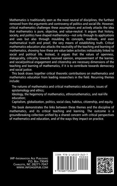 A volume in Cognition, Equity, & Society: International Perspectives Series Editors: Bharath Sriraman, University of Montana and Lyn English, Queensland University of Technology Mathematics is traditionally seen as the most neutral of disciplines, the furthest removed from the arguments and controversy of politics and social life. However, critical mathematics challenges these assumptions and actively attacks the idea that mathematics is pure, objective, and value¿neutral. It argues that history, society, and politics have shaped mathematics-not only through its applications and uses but also through molding its concepts, methods, and even mathematical truth and proof, the very means of establishing truth. Critical mathematics education also attacks the neutrality of the teaching and learning of mathematics, showing how these are value¿laden activities indissolubly linked to social and political life. Instead, it argues that the values of openness, dialogicality, criticality towards received opinion, empowerment of the learner, and social/political engagement and citizenship are necessary dimensions of the teaching and learning of mathematics, if it is to contribute towards democracy and social justice. This book draws together critical theoretic contributions on mathematics and mathematics education from leading researchers in the field. Recurring themes include: The natures of mathematics and critical mathematics education, issues of epistemology and ethics; Ideology, the hegemony of mathematics, ethnomathematics, and real¿life education; Capitalism, globalization, politics, social class, habitus, citizenship and equity. The book demonstrates the links between these themes and the discipline of mathematics, and its critical teaching and learning. The outcome is a groundbreaking collection unified by a shared concern with critical perspectives of mathematics and education, and of the ways they impact on practice.
