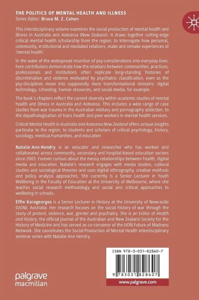 Chapter 1: Introduction: Remaking experiences and knowledges through critical mental health research in Australia and Aotearoa New Zealand Natalie Ann Hendry, Effie Karageorgos.- Part One: Contesting Psy-Knowledges in Institutional Spaces.- Chapter 2: Locating the moral genealogy of war trauma in the Australian Royal Commission into Defence and Veteran Suicide Effie Karageorgos.- Chapter 3: Psy-knowledges in the academy: Making space for critique - Emma Tseris.- Chapter 4: Educating emotions for well-being in Aotearoa New Zealand - Roberto McLeay.- Part Two: Empowering C/S/X in Research and Praxis.- Chapter 5: Co-producing histories of Australian community mental health, 1970-1990 - The Re; Minding Histories Research Group.- Chapter 6: Caring Madly/Madly caring - Aimee Sinclair.- Chapter 7: T nei te p nau mai te ao: Activating Indigenous system change Diana Kopua, Mark Kopua, Michelle Levy.- Part Three Self-Surveillance, Contagion and Pathologization.- Chapter 8: Digitalising the vagus nerve: Critical mental health and the total body - Jacinthe Flore.- Chapter 9: Is it real? Making and unmaking pornography addiction - Kris Taylor.- Chapter 10: Contesting progress narratives of depathologisation in trans health Rebecca Howe.- Chapter 11: Social media contagion, digital self-diagnosis and youth mental health Natalie Ann Hendry.- Chapter 12: Epilogue Bruce M.Z. Cohen.