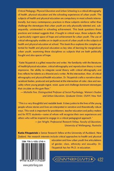 «Katie Fitzpatrick is a gifted researcher and writer. Her familiarity with the literatures of health/physical education, critical ethnography and reproduction theory is most impressive. Her ability to integrate social theory with critical ethnography and lives reflects her talents as a theorist and a writer. At the intersection, then, of critical ethnography and physical/health education, Dr. Fitzpatrick crafts a narrative about racialized bodies, produced and performed at the intersection of color, class and sexuality where young people ingest, resist, queer and challenge dominant stereotypes that circulate on the gym floor.» (Michelle Fine, Distinguished Professor of Social Psychology, Women's Studies and Urban Education, Graduate Center, CUNY, New York)