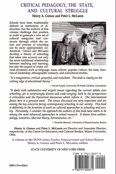Schools have been traditionally defined as institutions of instruction, but the authors of this volume challenge that position in order to generate a new set of cultural categories and constructs through which the nature and process of schooling can be more appropriately understood. Giroux and McLaren develop a theory of schooling that takes into account not only the more traditional relationship between teaching and learning, but also the import of wider cultural dynamics such as language, mass culture, popular culture, the state, theories of readership, ethnographic research, and subcultural studies.