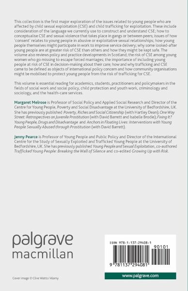 This volume is the first major exploration of the issues relevant to young people who are affected by sexual exploitation and trafficking from a variety of critical perspectives. Issues include accommodation, gangs, migrant and refugee communities, perpetrators, international policy and the language through which we construct child exploitation.