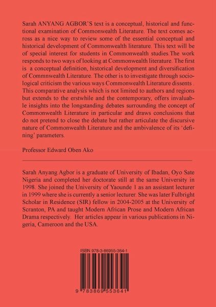 Sarah ANYANG AGBOR¿S text is a conceptual, historical and functional examination of Commonwealth Literature. The text comes across as a nice way to review some of the essential conceptual and historical development of Commonwealth literature. This text will be of special interest for students in Commonwealth studies.The work responds to two ways of looking at Commonwealth literature. The fi rst is a conceptual defi nition, historical development and diversifi cation of Commnwealth Literature. The other is to investigate through sociological criticism the various ways Commonwealth Literature dissents. This comparative analysis which is not limited to authors and regions but extends to the erstwhile and the contemporary, offers invaluable insights into the longstanding debates surrounding the concept of Commonwealth Literature in particular and draws conclusions that do not pretend to close the debate but rather articulate the discursive nature of Commonwealth Literature and the ambivalence of its ¿defi - ning¿ parameters. Professor Edward Oben Ako