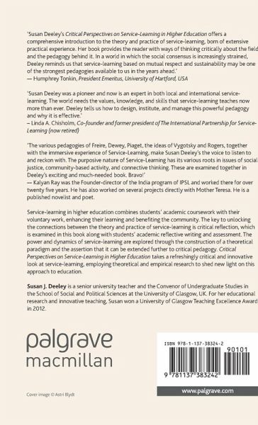 "Susan Deeley's Critical Perspectives on Service Learning in Higher Education offers a comprehensive introduction to the theory and practice of service-learning, born of extensive practical experience. Her book provides the reader with ways of thinking critically about the field and the pedagogy behind it. In a world in which the social consensus is increasingly strained, Deeley reminds us that service-learning based on mutual respect and sustainability may be one of the strongest pedagogies available to us in the years ahead." - Humphrey Tonkin, President Emeritus, University of Hartford, USA
