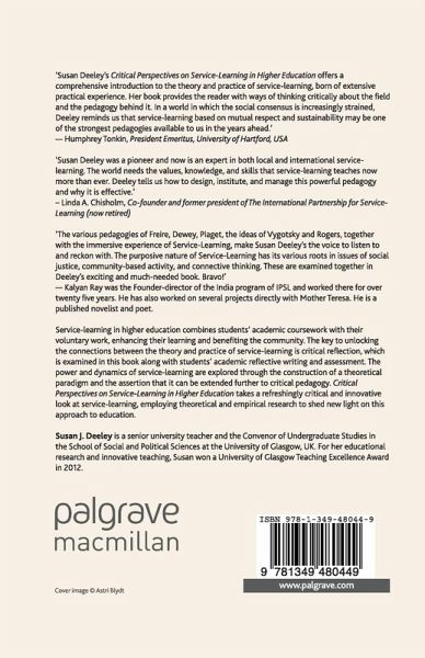 "Susan Deeley's Critical Perspectives on Service Learning in Higher Education offers a comprehensive introduction to the theory and practice of service-learning, born of extensive practical experience. Her book provides the reader with ways of thinking critically about the field and the pedagogy behind it. In a world in which the social consensus is increasingly strained, Deeley reminds us that service-learning based on mutual respect and sustainability may be one of the strongest pedagogies available to us in the years ahead." - Humphrey Tonkin, President Emeritus, University of Hartford, USA