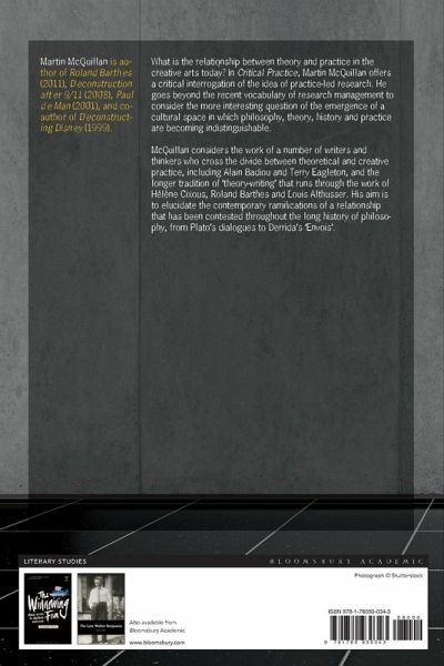 This book is available as open access through the Bloomsbury Open Access programme and is available on www.bloomsburycollections.com. What is the relationship between theory and practice in the creative arts today? In Critical Practice, Martin McQuillan offers a critical interrogation of the idea of practice-led research. He goes beyond the recent vocabulary of research management to consider the more interesting question of the emergence of a cultural space in which philosophy, theory, history and practice are becoming indistinguishable. McQuillan considers the work of a number of writers and thinkers who cross the divide between theoretical and creative practice, including Alain Badiou and Terry Eagleton, and the longer tradition of 'theory-writing' that runs through the work of Hélène Cixous, Roland Barthes and Louis Althusser. His aim is to elucidate the contemporary ramifications of a relationship that has been contested throughout the long history of philosophy, from Plato's dialogues to Derrida's 'Envois'.