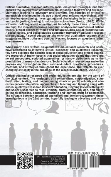 Critical qualitative research informs social education through a lens that ensures the investigation of issues in education tied to power and privilege, ultimately leading to advocacy and activism. The concept of critical is increasingly challenged in this age of neoliberal reform; nevertheless, critical implies questioning, investigating and challenging in terms of equity and social justice, leading to critical consciousness (Freire, 1970). While we resist defining social education, as hopefully these ideas / concepts are fluid, the idea stems from a continual analysis and synthesis of critical theory/ critical pedagogy, media and cultural studies, social reconstruction / social justice, and social studies education framed by culturally responsive pedagogy. A social education take on critical qualitative research thus suggests multiple truths and perspectives and focuses on questions rather than answers. While many have written on qualitative educational research and some have attempted to integrate critical pedagogy and qualitative research, few have explored the specific idea of social education and critical qualitative research. A major issue is that social education claims that there are no set procedures, scripted approaches, or narrow definitions as to the possibilities of research endeavors. Social education researchers make the process and investigation their own and adapt questions, procedures, methods, and strategies throughout the experience. This reflects an ever changing criticality in the bricolage of the research (Steinberg, 2011). Critical qualitative research and social education are vital for the world of the 21st century. The onslaught of neoliberalism, corporatization, standardization, testing, and the continuing attack on public schools and educators necessitate critical approaches to teaching and learning along with critical qualitative research in social education. Ongoing issues with equity and social justice tied to race, ethnicity, class, orientation, age, and ability linking to schooling, education, teaching and learning must be addressed. The struggle between unbridled capitalism and democracy warrant these investigations in the 21st century, hopefully leading to advocacy and activism.