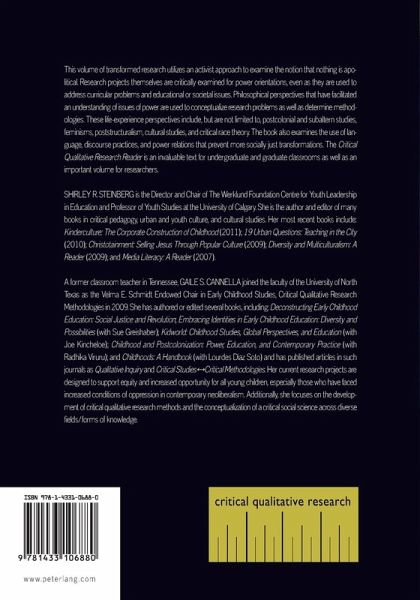 Contents: Shirley R. Steinberg: Preface. What is critical about qualitative research? - Phil Francis Carspecken: Basic Concepts in Critical Methodological Theory: Action, Structure and System within a Communicative Pragmatics Framework - Donald Easton-Brooks: The Conceptual Context of Knowledge - Mirka Koro-Ljungberg: Methodology is Movement is Methodology - Carolyn M. Shields: Critical Advocacy Research: An Approach Whose Time has Come - Margaret Somerville: The Critical Power of Place - Madeline Fox/Michelle Fine: Circulating Critical Research: Reflections on Performance and Moving Inquiry into Action - P. L. Thomas/Renita Schmidt: All That Jazz: Doing and Writing CQR in a Material World - Gaile S. Cannella/Yvonna S. Lincoln: Deploying Qualitative Methods for Critical Social Purposes - Joe L. Kincheloe/Peter McLaren/Shirley R. Steinberg: Critical Theory, Critical Pedagogy, and Qualitative Research - Kenneth Tobin: Interpretive Approaches to Multi-Level, Multi-Method, Multi-Theoretic Research - Shirley R. Steinberg: Critical Cultural Studies Research: Bricolage in Action - David W. Jardine: A Hitherto Concealed Experience that Transcends Thinking from the Position of Subjectivity - Kathleen deMarrais: Asking Critical Questions of Philanthropy and its Impact on U.S. Educational Policy: Tracking the Money in School Reform - Pepi Leistyna: Maintaining a Vibrant Synergy among Theory, Qualitative Research, and Social Activism in this Ever-Changing Age of Globalization - Jon Austin: Enlightening the Stranger Within: (Re)viewing Critical Research From/On/In the Centre - Andrew Hickey: The Critical Aesthetic: Living a Critical Ethnography of the Everyday - Mairi McDermott/Athena Madan: Avoiding the Missionary (Dis)position: Research Relations and (Re)presentation - sj Miller: Flawed Visions of Democracy in the United States: Influences on Current Critical Social Justice Research - Missy Morton: Who Will Be Heard? Qualitative Research and Legal Decisions about Facilitated Communication - Marianne N. Bloch/Ko Eun Kim: Governing Young Children's Learning through Educational Reform: A Poststructural Analysis of Discourses of Best Practice, Standards, and Quality - George J. Sefa Dei/Marlon Simmons: Writing Diasporic Indigeneity Through Critical Research and Social Method - Elizabeth McAdams Ducy/Laura M. Stough/M. Carolyn Clark: Choosing Agency in the Midst of Vulnerability: Using Critical Disability Theory to Examine a Disaster Narrative - Timothy J. Stanley: Excluded Narratives, Anti-racism and Historical Representation: Methodological Implications - Jessica Nina Lester: Researching the Discursive Function of Silence: A Reconsideration of the Normative Communication Patterns in the Talk of Children with Autism Labels - Tarquam McKenna/Davina B. Woods: An Indigenous Conversation - Artful Autoethnography - A Pre-colonized Collaborative Research Method? - Joe L. Kincheloe/Shirley R. Steinberg: Indigenous Knowledges in Education: Complexities, Dangers, and Profound Benefits - Ernest Morrell: Teachers as Critical Researchers: An Empowering Model for Urban Education - Amanda Benjamin: Listening in the Liminal: The In-between Spaces of Teaching Youth About Career and Adulthood - Greg S. Goodman/Walter Ullrich/Pedro Nava: Action Research for Critical Classroom and Community Change - Elizabeth B. Kozleski/Alfredo J. Artiles: Technical Assistance as Inquiry: Using Activity Theory Methods to Engage Equity in Educational Practice Communities - Victoria Perselli: Teaching in England: December 2010 - Claudia Sanchez/JoAnn Danelo Barbour: A Critical Approach to the Teaching and Learning of Critical Social Science at the College