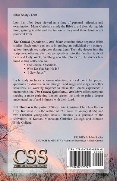 Lent has often been viewed as a time of personal reflection and examination. Many Christians study the Bible to aid them during this time, gaining insight and inspiration as they read these familiar, yet powerful texts. The Critical Questions... and More contains three separate Bible studies. Each study can assist in guiding an individual or a congregation through key scriptures during Lent. They dig deeper into the scriptures, offering alternate perspectives into the familiar texts of Lent and Holy Week, breathing new life into them. The studies featured in this collection are: • The Critical Questions • Who Do You Say He Is? • "I Saw Jesus." Each study includes a lesson objective, a focal point for prayer, questions for discussion and thought, and suggested songs and other resources, all working together to make the Lenten experience a memorable one. The Critical Questions... and More offers everyone seeking a more enriching Lenten season the tools to gain a deeper understanding of and intimacy with their Lord. Bill Thomas is the pastor of Stony Point Christian Church in Kansas City, Kansas. He is the author of The Road to Victory (CSS) and two Christian young-adult novels. Thomas is a graduate of the University of Kansas, Manhattan Christian College, and Johnson Bible College.