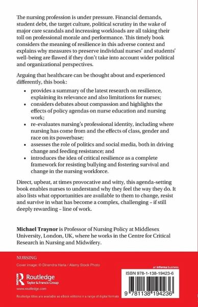 The nursing profession is under pressure. Financial demands, student debt, the target culture, political scrutiny in the wake of major care scandals and increasing workloads are all taking their toll on professional morale and performance. This timely book considers the meaning of resilience in this adverse context and explains why measures to preserve individual nurses' and students' well-being are flawed if they don't take into account wider political and organizational perspectives.