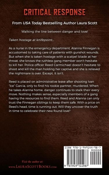 From USA Today Bestselling Author Laura Scott Walking the line between danger and love! Held hostage at knifepoint... As a nurse in the emergency department, Alanna Finnegan is accustomed to taking care of patients with gunshot wounds. But when she is taken hostage with a scalpel blade at her throat, she knows the ruthless gang member won't hesitate to kill her. Police officer Reed Carmichael doesn't hesitate to shoot and kill the man holding her captive and she is relieved the nightmare is over. Except, it isn't. Reed is placed on administrative leave after shooting Ivan "Ice" Garcia, only to find his rookie partner, murdered. When he takes Alanna home, danger continues to stalk their every move. Nothing makes sense, especially members of a gang having the resources to find them. Reed and Alanna can only trust the Finnegan siblings to keep them safe. With a price on Reed's head, time is running out. Will they uncover the truth in time to celebrate their new found love?