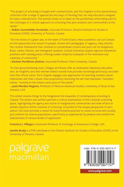 Foreword, George Dei.- Chapter 1. Continuing Important Conversations: An Introduction to this Volume, Francisco J. Villegas and Janelle Brady.- Chapter 2. "I'm Just a Friend Now": Community Policing in Toronto Schools, Gita Rao Madan.- Chapter 3. Restorative Justice: Moving From Punitive Sanctions to Proactive Interactions, Michelle H.A. Bailey.- Chapter 4. Canada's Legacy of Colonialism: Implications in Education, Jaqueline Benn-John.- Chapter 5. Resistance is Our Ancestral Knowledge: Incorporating Roots of Resistance into the Education of Adolescent Afro-Caribbean Girls in the Greater Toronto Area (GTA), Kimberley Moore and Celine D. Gibbons-Taylor.- Chapter 6. Disrupting Princesses: A Pedagogical Moment in Dismantling Colonial Norms and Representations of Beauty Through An Anti-Colonial Framework, Janelle Brady, and Zuhra Abawi.- Chapter 7. The First Three Years of Laen: From Unity-Seeking to Equity-Seeking, Catalina Calero, and Derik Chica.- Chapter 8. Active Communities and Practices of Resistance: Brief History of the Use of Schools as Border Zones in Toronto, Francisco J. Villegas.- Chapter 9. Be a Good Citizen or Else! Neoliberal Citizenship and the Grade Six 2013 Revised Ontario Social Studies Curriculum, Ardavan Eizadirad.- Chapter 10. "What Else Can I Do?": A Guide for Academics Who (Want To) Support Palestine, Sabrine Azraq.- Chapter 11. Bridging Borders: Teaching a Bridging Course with Precarious Status Students Transitioning to the University, Paloma E. Villegas.- Chapter 12. Self-Study of an Indigenous Settler in Ontario Schooling: An Exploration of Living Theory, Umar Umangay.- Chapter 13. Living Biocultures: A Framework for Building Sustainable Community Wellbeing, Resilience, and Innovation, Yessica D. Rostan.- Postscript, Carl E. James