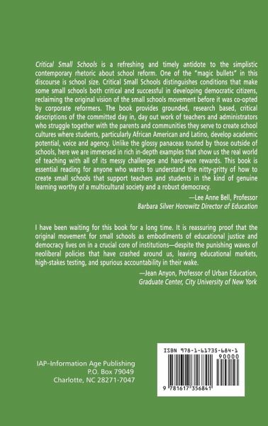 Critical Small Schools: Beyond Privatization in New York City Urban Educational Reform features the most current empirical research about the successes and challenges of the small schools movement and the implications of such for urban public educational policy. Situated in a climate of hierarchical reform, many of the principles of the original small schools movement-which are rooted in community participation, innovative pedagogies and assessment, and equity and social justice-have become obscured by an educational agenda that emphasizes top-down mandates and standards-based reform. With the increased popularity and the rapid proliferation of small schools, the emphasis on 'size only' has resulted in a bifurcation of the small schools movement; on one end are the small schools which have embraced the democratic, participatory, and self-governing nature of the original movement, while on the other end are schools that have simply reduced their size without rethinking school structures and practices. This book distinguishes the small schools featured and researched in this volume from schools that are simply small and labels them "critical small schools." By documenting the practices that take place in various critical small schools in New York City, we show how these schools have narrowed the achievement gap and increased graduation and college acceptance rates. Although smallness is an essential feature in the design of these schools, it is certainly not the only one and this volume illuminates the other elements that contribute to these schools' successes and shortcomings. Critical Small Schools also challenges the recent emphasis on charter schools as a panacea for urban educational reform. By featuring research about the inner workings of public schools, this volume challenges this new direction that steers successful school development away from public education. Moreover, as every site is fraught with some tension, Critical Small Schools not only offers glimpses into intellectually vibrant and democratic learning communities, but also acknowledges that these concepts are not static and necessitate continual reflection and renewal. At this pivotal moment in educational reform, this volume provides keen insight into the challenges and possibilities of the small schools movement and is indispensable for anyone interested in comprehensive public school reform.