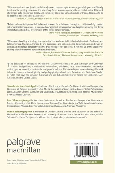 Introduction: The Latin American Keywords Project: A Critical Disciplinary Genealogy; Yolanda Martínez-San Miguel, Ben Sifuentes-Jáuregui, and Marisa Belausteguigoitia.- 1. Indigenism, Zapatismo and Indigeneidad: Listening to the Space of Silence; Marisa Belausteguigoitia.- 2. Indigenismo as Nationalism, From the Liberal to the Revolutionary Era; María Josefina Saldaña-Portillo.- 3. Americanism/o: Intercultural Border Zones in Post-social Times; Juan Poblete.- 4. Americanism/o and the Internalization of U.S. Imperialism: A Response to Juan Poblete; John Carlos Rowe.- 5. Colonialism, Postcolonial, Neocolonial, Internal Colonialism, Coloniality and Decoloniality; Nelson Maldonado Torres.- 6. Mapping Colonial Resistance: Colonialism, Anti- '' ''Indianism, '' '' and Nationalism in the Americas; Leece Lee-Oliver.- 7. Criollismo, Creole and Créolité; José Antonio Mazzotti.- 8. Creole, Criollismo and Créolité; H. Adlai Murdoch.- 9. Race and the Constitutive Inequality of the Modern/Colonial Condition; José Buscaglia-Salgado.- 10. The Asian Presence in Mestizo Nations: A Response; Kathleen López.- 11. Transculturation, Syncretism, and Hibridity; Jossianna Arroyo.- 12. The Persistence of Racism in Critical Imaginaries on Latin America; Laura Catelli.- 13. Modernity and Modernization: the Geopolitical Relocation of Latin America; Graciela Montaldo.- 14. Beyond Modernity; Alejandra Laera.- 15. The Latin America Nation and its Cultural Inscriptions: Archives of Promise or Lament?; Román de la Campa.- 16. Multiplicity and its Discontents: A Response to Román de la Campa; Héctor Hoyos.- 17. Gender/Género in Latin America; Lawrence La Fountain-Stokes.- 18. Gender Travels South: Response to Lawrence La Fountain-Stokes; Montserrat Sagot.- 19. Queer/Sexualities; Licia Fiol Matta.- 20. Queer Articulations; Carlos Figari.- 21. Testimonio: The Witness, the Truth and the Inaudible; Ana Forcinito.- 22. Enunciating Alleged Truths: A Response to Ana Forcinito; Arturo Arias.- 23. Lo popular/ Popular Culture: Performing the Borders of Power and Resistance; Ignacio M. Sánchez Prado.- 24. Globalized Digital Popular Cultures: A Response to Ignacio Sánchez Prado; Susan Antebi.