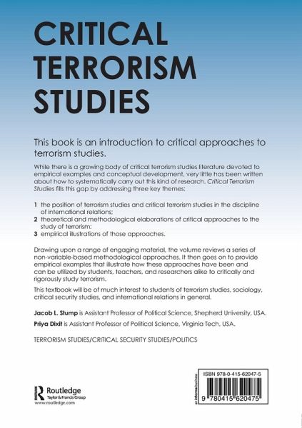 This book is an introduction to critical approaches to terrorism studies. While there is a growing body of Critical Terrorism Studies (CTS) literature devoted to empirical examples and conceptual development, very little has been written about how to systematically carry out this kind of research. Critical Terrorism Studies fills this gap by addressing three key themes: The position of terrorism studies and critical terrorism studies in the discipline of International Relations (IR) Theoretical and methodological elaborations of critical approaches to the study of terrorism Empirical illustrations of those approaches. Drawing upon a range of engaging material, the volume reviews a series of non-variable based methodological approaches. It then goes on to provide empirical examples that illustrate how these approaches have been and can be utilized by students, teachers, and postgraduate researchers alike to critically and rigorously study terrorism. This textbook will be of much interest to students of terrorism studies, sociology, critical security studies, and IR in general.
