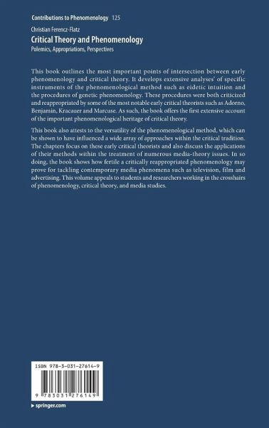 This book outlines the most important points of intersection between early phenomenology and critical theory. It develops extensive analyses' of specific instruments of the phenomenological method such as eidetic intuition and the procedures of genetic phenomenology. These procedures were both criticized and reappropriated by some of the most notable early critical theorists such as Adorno, Benjamin, Kracauer and Marcuse. As such, the book offers the first extensive account of the important phenomenological heritage of critical theory.