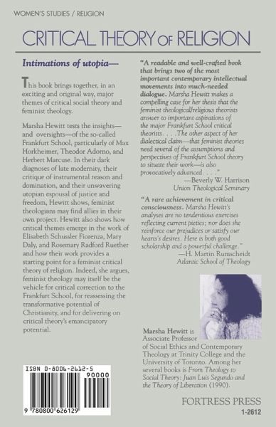 Marsha Hewitt tests the insights - and oversights - of the so-called Frankfurt School, particularly of Max Horkheimer, Theodor Adorno, and Herbert Marcuse. In their dark diagnoses of late modernity, their critique of instrumental reason and domination, and their unwavering utopian espousal of justice and freedom, Hewitt shows, feminist theologians may find allies in their own project. Hewitt also shows how critical themes emerge in the work of Elisabeth Schussler Fiorenza, Mary Daly, and Rosemary Radford Ruether and how their work provides a starting point for a feminist critical theory of religion. Indeed, she argues, feminist theology may itself be the vehicle for critical correction to the Frankfurt School, for reassessing the transformative potential of Christianity, and for delivering on critical theory's emancipatory potential.