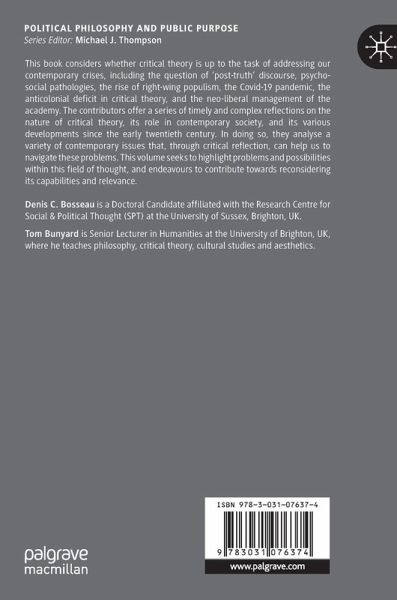 This book considers whether critical theory is up to the task of addressing our contemporary crises, including the question of 'post-truth' discourse, psycho-social pathologies, the rise of right-wing populism, the Covid-19 pandemic, the anticolonial deficit in critical theory, and the neo-liberal management of the academy. The contributors offer a series of timely and complex reflections on the nature of critical theory, its role in contemporary society, and its various developments since the early twentieth century. In doing so, they analyse a variety of contemporary issues that, through critical reflection, can help us to navigate these problems. This volume seeks to highlight problems and possibilities within this field of thought, and endeavours to contribute towards reconsidering its capabilities and relevance.