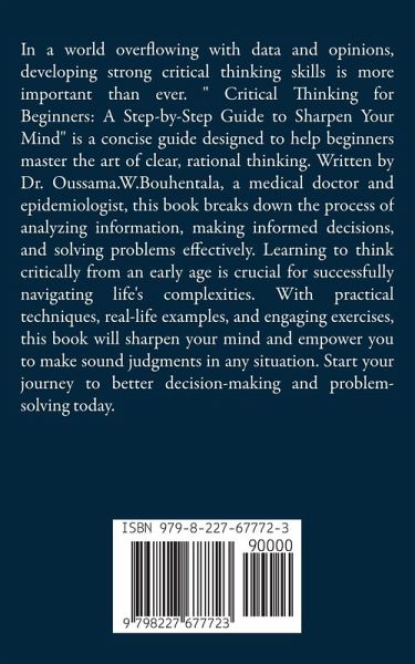 In a world overflowing with data and opinions, developing strong critical thinking skills is more important than ever. " Critical Thinking for Beginners: A Step-by-Step Guide to Sharpen Your Mind" is a concise guide designed to help beginners master the art of clear, rational thinking. Written by Dr. Oussama.W.Bouhentala, a medical doctor and epidemiologist, this book breaks down the process of analyzing information, making informed decisions, and solving problems effectively. Learning to think critically from an early age is crucial for successfully navigating life's complexities. With practical techniques, real-life examples, and engaging exercises, this book will sharpen your mind and empower you to make sound judgments in any situation. Start your journey to better decision-making and problem-solving today.