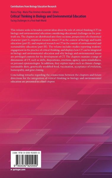 This volume seeks to broaden current ideas about the role of critical thinking (CT) in biology and environmental education considering educational challenges in the post-truth era. The chapters are distributed into three sections, perspectives of a theoretical character (part I), empirical research about CT in the context of biology and health education (part II), and empirical research on CT in the context of environmental and sustainability education (part III). The volume includes studies reporting students' engagement in the practice of critical thinking, and displays how CT can be integrated in biology and environmental education and why biology and environmental issues are privileged contexts for the development of CT. The chapters examine a range of dimensions of CT, such as skills, dispositions, emotions, agency, open-mindedness, or personal epistemologies. In addition, they explore topics such as climate change, sustainable diets, genetically modified food, vaccination, acceptance of evolution, homeopathy, and gene cloning.