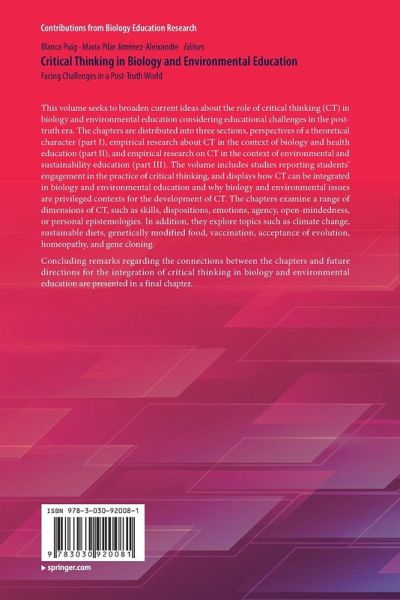 This volume seeks to broaden current ideas about the role of critical thinking (CT) in biology and environmental education considering educational challenges in the post-truth era. The chapters are distributed into three sections, perspectives of a theoretical character (part I), empirical research about CT in the context of biology and health education (part II), and empirical research on CT in the context of environmental and sustainability education (part III). The volume includes studies reporting students' engagement in the practice of critical thinking, and displays how CT can be integrated in biology and environmental education and why biology and environmental issues are privileged contexts for the development of CT. The chapters examine a range of dimensions of CT, such as skills, dispositions, emotions, agency, open-mindedness, or personal epistemologies. In addition, they explore topics such as climate change, sustainable diets, genetically modified food, vaccination, acceptance of evolution, homeopathy, and gene cloning.