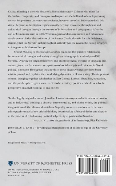 Critical Thinking in Slovakia after Socialism interrogates the putative relationship between critical thought and society through an ethnographic study of civic discourse in post-1989 Slovakia. Drawing on original fieldwork as well as on anthropological theories of language and culture, Jonathan Larson uncovers traces of patterned elements of criticism throughout the Slovak political discourse. In addition, he exposes ways that these discursive practices have been misinterpreted and overlooked, and outlines unexpected historical and interactive limitations on criticism. This important volume, bringing together scholarship on East Central Europe, liberalism, education, and the public sphere, gives students of modern history, political science, and economics fresh perspective on an essential civic skill. Jonathan L. Larson is visiting assistant professor of anthropology at the University of Iowa.