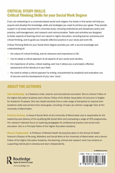 Jane Bottomley is a freelance writer, teacher and educational consultant. She is a Senior Fellow of the Higher Education Academy and a Senior Fellow of the British Association of Lecturers in English for Academic Purposes. She has helped students from a wide range of disciplines to improve their academic skills and achieve their study goals, including 14 years as a Senior Language Tutor at the University of Manchester. Jane is the editor of the Critical Study Skills series, which covers nursing, education and social work. Pat Cartney is Head of Social Work in the School of Health Sciences Division of Nursing, Midwifery and Social Work at the University of Manchester. She is a Principal Fellow of the Higher Education Academy. Her teaching and research interests focus on exploring how people learn best about professional practice and how they become knowledgeable and skilled social work practitioners. Steven Pryjmachuk is Professor of Mental Health Nursing Education in the School of Health Science's Division of Nursing, Midwifery and Social Work at the University of Manchester and a Senior Fellow of the Higher Education Academy. His teaching, clinical and research work has centred largely on supporting and facilitating individuals - be they students, patients or colleagues - to develop, learn or care independently. In December 2014, Steven was elected as vice Chair (2015-16) and Chair (2017-18) of Mental Health Nurse Academics UK, an organisation representing 65 Higher Education Institutions providing education and research on mental health nursing.