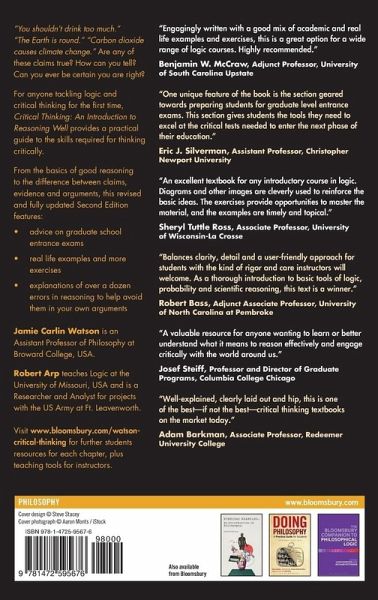 'You shouldn't drink too much. The Earth is round. Milk is good for your bones.' Are any of these claims true? How can you tell? Can you ever be certain you are right? For anyone tackling philosophical logic and critical thinking for the first time, Critical Thinking: An Introduction to Reasoning Well provides a practical guide to the skills required to think critically. From the basics of good reasoning to the difference between claims, evidence and arguments, Robert Arp and Jamie Carlin Watson cover the topics found in an introductory course. Now revised and fully updated, this Second Edition features a glossary, chapter summaries, more student-friendly exercises, study questions, diagrams, and suggestions for further reading. Topics include: the structure, formation, analysis and recognition of arguments deductive validity and soundness inductive strength and cogency inference to the best explanation truth tables tools for argument assessment informal and formal fallacies With real life examples, advice on graduate school entrance exams and an expanded companion website packed with additional exercises, an answer key and help with real life examples, this easy-to-follow introduction is a complete beginner's tool set to good reasoning, analyzing and arguing. Ideal for students in basic reasoning courses and students preparing for graduate school.