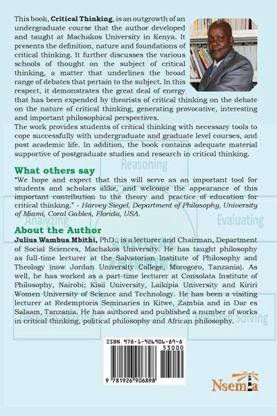 This book, Critical Thinking, is an outgrowth of an undergraduate course that the author developed and taught at Machakos University in Kenya. It presents the definition, nature, and foundations of critical thinking. It further discusses the various schools of thought on the subject of critical thinking, a matter that underlines the broad range of debates that pertain to the subject. In this respect, it demonstrates a great deal of energy that has been expended by theorists of critical thinking on the debate on the nature of critical thinking, generating provocative, interesting and important philosophical perspectives. The work provides students of Critical Thinking with necessary tools to cope successfully with undergraduate and graduate-level courses, and post-academic life. It contains adequate material supportive of postgraduate studies and research in critical thinking.
