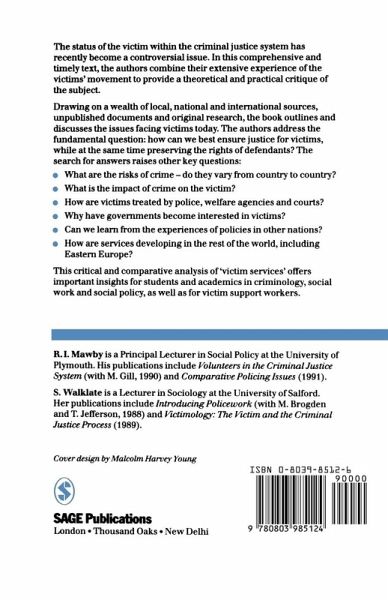 Drawing on a wealth of local, national and international sources, unpublished documents and original research, this book provides a theoretical and practical critique of victimology. The authors outline and discuss the issues facing victims today and address the fundamental question: How can we best ensure justice for victims, while at the same time preserving the rights of defendants? The search for answers raises other key questions: What are the risks of crime and do they vary from country to country? What is the impact of crime on the victim? How are victims treated by police, welfare agencies and courts? Why have governments become interested in victims? Can we learn from the experiences of policies in other nations? How are services developing in the rest of the world, including Eastern Europe? This critical and comparative analysis of `victim services¿ offers important insights for students and academics in criminology, social work and social policy, as well as for victim support workers.
