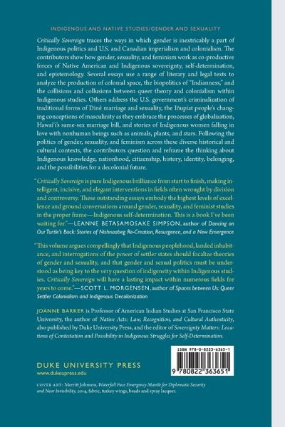 Critically Sovereign traces the ways in which gender is inextricably a part of Indigenous politics and U.S. and Canadian imperialism and colonialism. The contributors show how gender, sexuality, and feminism work as co-productive forces of Native American and Indigenous sovereignty, self-determination, and epistemology. Several essays use a range of literary and legal texts to analyze the production of colonial space, the biopolitics of "Indianness," and the collisions and collusions between queer theory and colonialism within Indigenous studies. Others address the U.S. government's criminalization of traditional forms of Diné marriage and sexuality, the Iñupiat people's changing conceptions of masculinity as they embrace the processes of globalization, Hawai'i's same-sex marriage bill, and stories of Indigenous women falling in love with non-human beings such as animals, plants, and stars. Following the politics of gender, sexuality, and feminism across these diverse historical and cultural contexts, the contributors question and reframe the thinking about Indigenous knowledge, nationhood, citizenship, history, identity, belonging, and the possibilities for a decolonial future. Contributors. Jodi A. Byrd, Joanne Barker, Jennifer Nez Denetdale, Mishuana Goeman, J. K¿haulani Kauanui, Melissa K. Nelson, Jessica Bissett Perea, Mark Rifkin