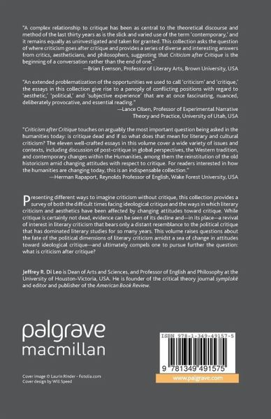 Presenting different ways to imagine criticism without critique, this collection provides a survey of both the difficult times facing ideological critique and the ways in which literary criticism and aesthetics have been affected by changing attitudes toward critique.
