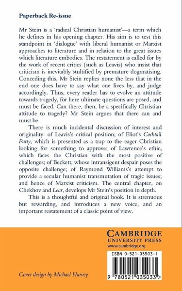 Walter Stein is a 'radical Christian humanist' - a term which he defines in his opening chapter. His aim is to test this standpoint in 'dialogue' with liberal humanist or Marxist approaches to literature and in relation to the great issues which literature embodies. The restatement is called for by the work of recent critics (such as Leavis) who insist that criticism is inevitably stultified by premature dogmatizing. Conceding this, Stein replies that in the end one does have to say what one lives by and judge accordingly. Thus every reader has to evolve an attitude towards tragedy, for here ultimate questions are posed, and must be faced. The book argues that there can be a specifically Christian attitude to tragedy. This is a thoughtful and original book. It is strenuous but rewarding, an important restatement of a classic point of view.