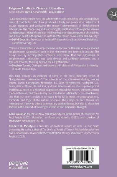 This book provides an overview of some of the most important critics of "Enlightenment rationalism." The subjects of the volume-including, among others, Burke, Kierkegaard, Nietzsche, T.S. Eliot, Wittgenstein, Heidegger, C.S. Lewis, Gabriel Marcel, Russell Kirk, and Jane Jacobs-do not share a philosophical tradition as much as a skeptical disposition toward the notion, common among modern thinkers, that there is only one standard of rationality or reasonableness, and that that one standard is or ought to be taken from the presuppositions, methods, and logic of the natural sciences.