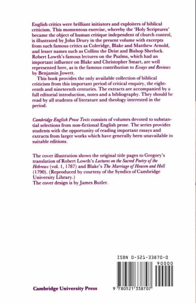 English critics were brilliant initiators and exploiters of biblical criticism. This momentous exercise, whereby the 'Holy Scriptures' became the object of human critique independent of church control, is illustrated by John Drury in the present volume with excerpts from such famous critics as Coleridge, Blake and Matthew Arnold, and lesser names such as Collins and Deist and Bishop Sherlock. Robert Lowth's famous lectures on the Psalms, which had an important influence on Blake and Christopher Smart, are well represented here, as is the famous contribution to Essays and Reviews by Benjamin Jowett. This book provides the only available collection of biblical criticism from this important period of critical enquiry, the eighteenth and nineteenth centuries. The extracts are accompanied by a full editorial introduction, notes and a bibliography. They should be read by all students of literature and theology interested in the period.