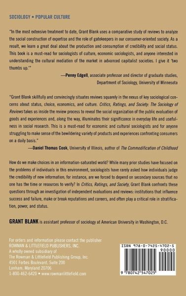 In the most extensive treatment to date, Grant Blank uses a comparative study of reviews to analyze the social construction of expertise and the role of gatekeepers in our consumer-oriented society. As a result, we learn a great deal about the production and consumption of credibility and social status. This book is a must-read for sociologists of culture, economic sociologists, and anyone interested in understanding the cultural mediation of the market in advanced capitalist societies. I give it "two thumbs up." -- Penny Edgell, Associate Professor and Director of Graduate Studies, Department of Sociology, University of Minnesota ... a fascinating interdisciolinary study ... -- Gary Day Time Magazine Education Supplement Much to his credit, Grant Blank shows reviews and ratings to be far more important and relevant than they may seem at first sight... Blank's new book is not just a research monograph on critical rating systems. It also seeks to clarify the ways in which credible information is created and received and how reviews and ratings contribute to the creation and maintenance of status distinctions. American Journal of Sociology Grant Blank skillfully and convincingly situates reviews squarely in the nexus of key sociological concerns about status, choice, economics, and culture. Critics, Ratings, and Society: The Sociology of Reviews takes us inside the review process to reveal the social organization of the public evaluation of goods and experiences and, along the way, illuminates their significance in everyday life and usefulness in social research... This is a must read for economic and cultural sociologists and for anyone struggling to make sense of the bewildering variety of products and experiences confronting consumers on a daily basis. -- Daniel Thomas Cook, University of Illinois, author of The Commodification of Childhood