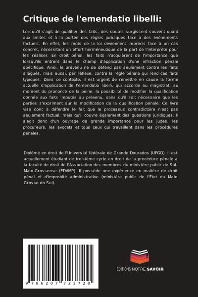 Lorsqu'il s'agit de qualifier des faits, des doutes surgissent souvent quant aux limites et à la portée des règles juridiques face à des événements factuels. En effet, les mots de la loi deviennent imprécis face à un cas concret, nécessitant un effort herméneutique de la part de l'interprète pour les réaliser. En droit pénal, les faits n'acquièrent de l'importance que lorsqu'ils entrent dans le champ d'application d'une infraction pénale spécifique. Ainsi, le prévenu ne se défend pas seulement contre les faits allégués, mais aussi, par réflexe, contre la règle pénale qui rend ces faits typiques. Dans ce contexte, il est urgent de remettre en cause la forme actuelle d'application de l'emendatio libelli, qui accorde au magistrat, au moment du prononcé de la peine, la possibilité de modifier la qualification donnée aux faits imputés au prévenu, sans qu'il soit nécessaire que les parties s'expriment sur la modification de la qualification pénale. Ce livre vise donc à défendre le fait que le processus contradictoire n'est pas seulement factuel, mais qu'il couvre également des questions juridiques. Il s'agit donc d'un ouvrage de grande importance pour les juges, les procureurs, les avocats et tous ceux qui travaillent dans les procédures pénales.