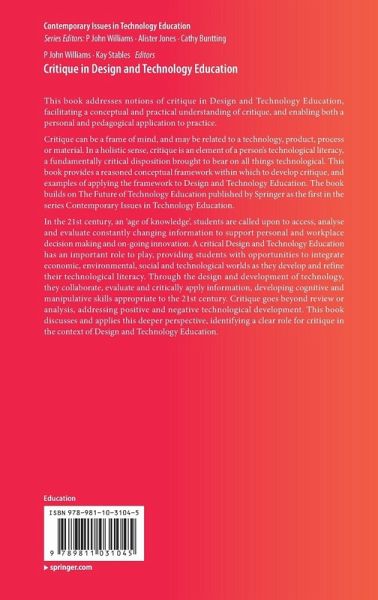 In the 21st century, an 'age of knowledge', students are called upon to access, analyse and evaluate constantly changing information to support personal and workplace decision making and on-going innovation. A critical Design and Technology Education has an important role to play, providing students with opportunities to integrate economic, environmental, social and technological worlds as they develop and refine their technological literacy. Through the design and development of technology, they collaborate, evaluate and critically apply information, developing cognitive and manipulative skills appropriate to the 21st century. Critique goes beyond review or analysis, addressing positive and negative technological development. This book discusses and applies this deeper perspective, identifying a clear role for critique in the context of Design and Technology Education.