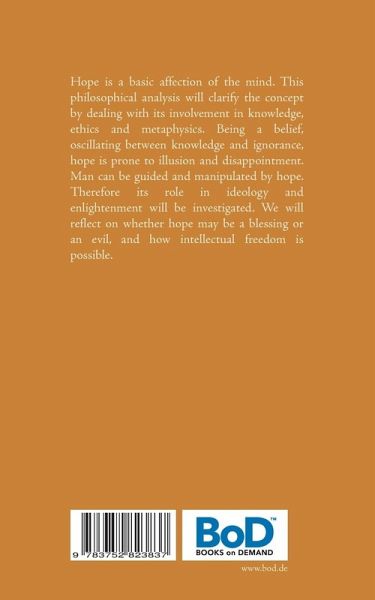 Hope is a basic affection of the mind. This philosophical analysis will clarify the concept by dealing with its involvement in knowledge, ethics and metaphysics. Being a belief, oscillating between knowledge and ignorance, hope is prone to illusion and disappointment. Man can be guided and manipulated by hope. Therefore its role within ideology and enlightenment will be investigated. We will reflect on whether hope may be a blessing or an evil and on how intellectual freedom is possible.