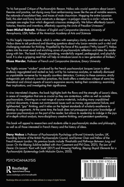 In nine interrelated chapters, the book highlights both the flaws and the strengths of Lacan's ideas, in areas of investigation that are as crucial as they are contentious, within as well as outside psychoanalysis. Drawing on a vast range of source materials, including many unpublished archival documents, it teases out controversial issues such as money, organisational failure, and lighthearted, "gay" thinking, and it relies on the highest standards of scholarly excellence to develop its arguments. At the same time, the book does not presuppose any prior knowledge of Lacanian psychoanalysis on the part of the reader, but allows its readership to indulge in the joys of in-depth critical analysis, trans-disciplinary creative thinking, and persistent questioning.