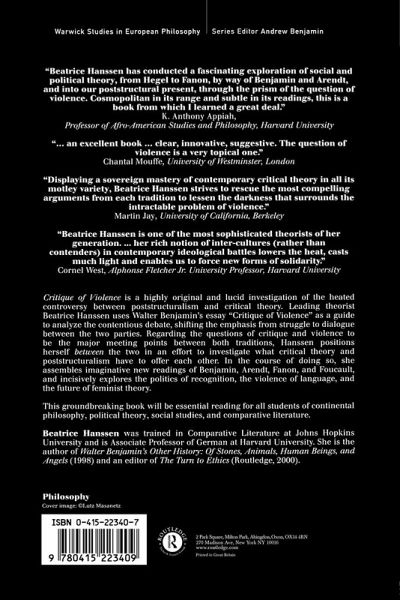 Critique of Violence is a highly original and lucid investigation of the heated controversy between poststructuralism and critical theory. Leading theorist Beatrice Hanssen uses Walter Benjamin's essay 'Critique of Violence' as a guide to analyse the contentious debate, shifting the emphasis from struggle to dialogue between the two parties. Regarding the questions of critique and violence as the major meeting points between both traditions, Hanssen positions herself between the two in an effort to investigate what critical theory and poststructuralism have to offer each other. In the course of doing so, she assembles imaginative new readings of Benjamin, Arendt, Fanon and Foucault, and incisively explores the politics of recognition, the violence of language, and the future of feminist theory. This groundbreaking book will be essential reading for all students of continental philosophy, political theory, social studies and comparative literature. Also available in this series: Essays on Otherness Hb: 0-415-13107-3: £50.00 Pb: 0-415-13108-1: £15.99 Hegel After Derrida Hb: 0-415-17104-4: £50.00 Pb: 0-415-17105-9: £15.99 The Hypocritical Imagination Hb: 0-415-21361-4: £47.50 Pb: 0-415-21362-2: £15.99 Philosophy and Tragedy Hb: 0-415-19141-6: £45.00 Pb: 0-415-19142-4: £14.99 Textures of Light Hb: 0-415-14273-3: £42.50 Pb: 0-415-14274-1: £13.99 Very Little ... Almost Nothing Pb: 0-415-12821-8: £47.50 Pb: 0-415-12822-6: £15.99