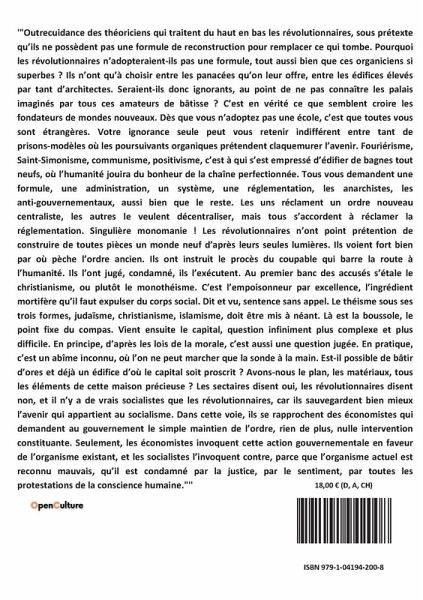 '"Outrecuidance des théoriciens qui traitent du haut en bas les révolutionnaires, sous prétexte qüils ne possèdent pas une formule de reconstruction pour remplacer ce qui tombe. Pourquoi les révolutionnaires n¿adopteraient-ils pas une formule, tout aussi bien que ces organiciens si superbes ? Ils n¿ont qüà choisir entre les panacées qüon leur offre, entre les édifices élevés par tant d¿architectes. Seraient-ils donc ignorants, au point de ne pas connaître les palais imaginés par tous ces amateurs de bâtisse ? C¿est en vérité ce que semblent croire les fondateurs de mondes nouveaux. Dès que vous n¿adoptez pas une école, c¿est que toutes vous sont étrangères. Votre ignorance seule peut vous retenir indifférent entre tant de prisons-modèles où les poursuivants organiques prétendent claquemurer l¿avenir. Fouriérisme, Saint-Simonisme, communisme, positivisme, c¿est à qui s¿est empressé d¿édifier de bagnes tout neufs, où l¿humanité jouira du bonheur de la chaîne perfectionnée. Tous vous demandent une formule, une administration, un système, une réglementation, les anarchistes, les anti-gouvernementaux, aussi bien que le reste. Les uns réclament un ordre nouveau centraliste, les autres le veulent décentraliser, mais tous s¿accordent à réclamer la réglementation. Singulière monomanie ! Les révolutionnaires n¿ont point prétention de construire de toutes pièces un monde neuf d¿après leurs seules lumières. Ils voient fort bien par où pèche l¿ordre ancien. Ils ont instruit le procès du coupable qui barre la route à l¿humanité. Ils l¿ont jugé, condamné, ils l¿exécutent. Au premier banc des accusés s¿étale le christianisme, ou plutôt le monothéisme. C¿est l¿empoisonneur par excellence, l¿ingrédient mortifère qüil faut expulser du corps social. Dit et vu, sentence sans appel. Le théisme sous ses trois formes, judaïsme, christianisme, islamisme, doit être mis à néant. Là est la boussole, le point fixe du compas. Vient ensuite le capital, question infiniment plus complexe et plus difficile. En principe, d¿après les lois de la morale, c¿est aussi une question jugée. En pratique, c¿est un abîme inconnu, où l¿on ne peut marcher que la sonde à la main. Est-il possible de bâtir d¿ores et déjà un édifice d¿où le capital soit proscrit ? Avons-nous le plan, les matériaux, tous les éléments de cette maison précieuse ? Les sectaires disent oui, les révolutionnaires disent non, et il n¿y a de vrais socialistes que les révolutionnaires, car ils sauvegardent bien mieux l¿avenir qui appartient au socialisme. Dans cette voie, ils se rapprochent des économistes qui demandent au gouvernement le simple maintien de l¿ordre, rien de plus, nulle intervention constituante. Seulement, les économistes invoquent cette action gouvernementale en faveur de l¿organisme existant, et les socialistes l¿invoquent contre, parce que l¿organisme actuel est reconnu mauvais, qüil est condamné par la justice, par le sentiment, par toutes les protestations de la conscience humaine."''