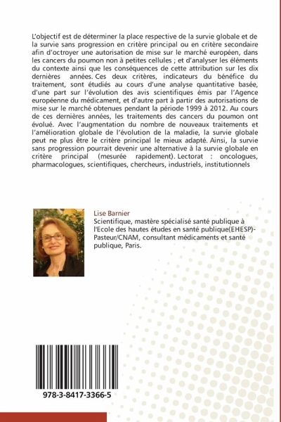 L objectif est de déterminer la place respective de la survie globale et de la survie sans progression en critère principal ou en critère secondaire afin d octroyer une autorisation de mise sur le marché européen, dans les cancers du poumon non à petites cellules ; et d analyser les éléments du contexte ainsi que les conséquences de cette attribution sur les dix dernières années. Ces deux critères, indicateurs du bénéfice du traitement, sont étudiés au cours d une analyse quantitative basée, d une part sur l évolution des avis scientifiques émis par l Agence européenne du médicament, et d autre part à partir des autorisations de mise sur le marché obtenues pendant la période 1999 à 2012. Au cours de ces dernières années, les traitements des cancers du poumon ont évolué. Avec l augmentation du nombre de nouveaux traitements et l amélioration globale de l évolution de la maladie, la survie globale peut ne plus être le critère principal le mieux adapté. Ainsi, la survie sans progression pourrait devenir une alternative à la survie globale en critère principal (mesurée rapidement). Lectorat : oncologues, pharmacologues, scientifiques, chercheurs, industriels, institutionnels