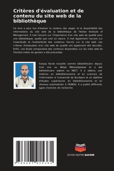 Ce livre a pour but d'évaluer le contenu des pages et la disponibilité des informations du site web de la bibliothèque de l'Indian Institute of Management. Il met l'accent sur l'importance d'un site web de qualité pour une bibliothèque, quelle que soit sa nature. Il met également l'accent sur l'exactitude et l'authenticité des contenus fournis sur le site web. Les critères d'évaluation d'un site web de qualité ont également été discutés. Enfin, une étude comparative des contenus disponibles sur les sites web de l'Institut indien de gestion a été présentée.