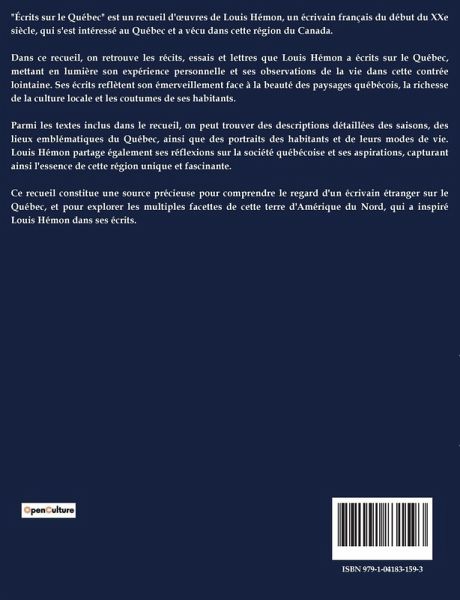 Louis Hémon, auteur de l'inoubliable ' Maria Chapdelaine ', nous offre avec ' Écrits sur le Québec ' une immersion dans le Québec du début du XXe siècle. Ce recueil, à la fois littéraire et ethnographique, nous transporte dans une époque où les vastes étendues enneigées et les forêts denses façonnent le quotidien des habitants. À travers ses observations minutieuses, Hémon dépeint un monde où la nature impose ses lois et où les hommes et les femmes luttent pour survivre et prospérer. Le Québec de cette époque est un territoire en pleine mutation, où les traditions ancestrales côtoient les prémices de la modernité. Hémon, avec son regard d'étranger, capte les nuances de cette société en pleine évolution, offrant une perspective de changement sur les coutumes, les croyances et les aspirations des Québécois. Les récits et descriptions qu'il propose sont autant de fenêtres ouvertes sur un monde à la fois rude et poétique, où la solidarité et l'adaptation sont des valeurs essentielles. Les thématiques abordées dans ' Écrits sur le Québec ' sont variées: de la vie quotidienne des colons à la beauté sauvage des paysages, en passant par les défis économiques et sociaux de l'époque. Hémon nous invite à découvrir un Québec authentique, loin des clichés, où chaque page est une invitation à la réflexion et à l'émerveillement. En nous plongeant dans cet univers, Louis Hémon nous offre une compréhension plus profonde de l'âme québécoise et de son rapport à la terre. Ce livre est un hommage à la nature et à la culture d'une région qui, malgré les épreuves, continue de vibrer d'une énergie singulière.