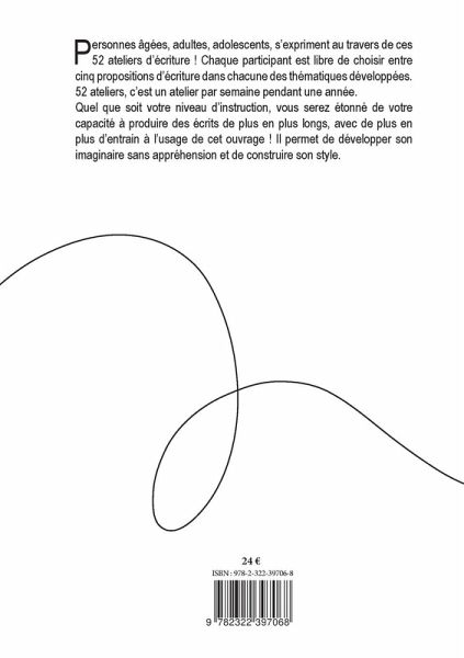 Ateliers d'écriture en groupe ou en individuel. Personnes âgées, adultes, adolescents, s'expriment au travers de ces 52 ateliers d'écriture ! 52 ateliers, c'est un atelier par semaine pendant une année. Chaque participant est libre de choisir entre cinq propositions d'écriture dans chacune des thématiques développées. Le premier livre dans le genre aux 256 propositions d'écriture ! Quel que soit votre niveau d'instruction, vous serez étonné de votre capacité à produire des écrits de plus en plus longs, avec de plus en plus d'entrain à l'usage de cet ouvrage ! La possibilité d'un atelier en suivi personnalisé comme la mise en place d'ateliers pour groupe sont également proposéesLes thématiques d'ateliers du livre 1 : La chambre - Le chagrin - Le mensonge - Venise - Le métro - Le vol - Les rêves - La bonté - L'ennui - L'amour - La pluie - Le cadeau - Le silence - Mon père - Le vent - Insomnie Sommeil- Les fleurs - Lettre au père Noël - Merci - Le soleil- Le parfum - La superstition Le conseil - Le plaidoyer - Le testament - L'horoscope - L'amitié - La mer - La peur - Le poison - Le courage - Le baiser - L'aveu - Le travail - Le conditionnel - Le vin - Le pays d'où je viens - La liberté - Le critique( d'Art)- Le paysage - La promesse - La solitude - Le carnet d'adresse - Ma mère - Le chat - Je t'aime - La colère - La mémoire - La neige - Le deuil - La joie - L'argent - La première page