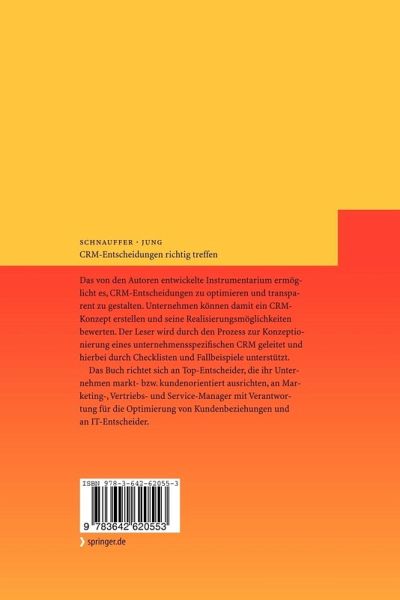Die Autoren haben ein Instrumentarium entwickelt, um CRM-Entscheidungen in Unternehmen zu optimieren und transparent zu gestalten. Unternehmen können damit ein CRM-Konzept erstellen und dessen Realisierungsmöglichkeiten bewerten. Der Leser wird durch den Prozess zur Konzeptionierung eines unternehmensspezifischen CRM geleitet und hierbei durch Checklisten und Fallbeispiele unterstützt.