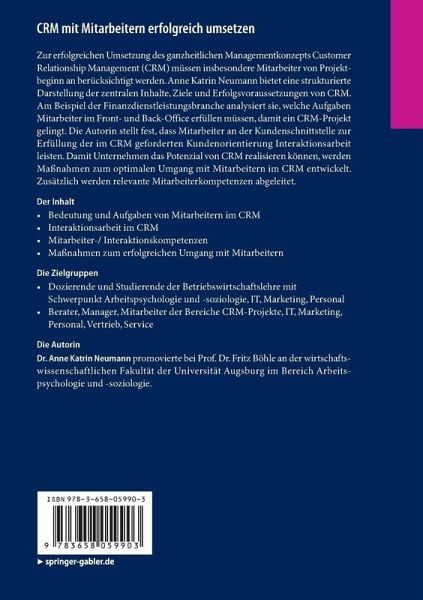 Zur erfolgreichen Umsetzung des ganzheitlichen Managementkonzepts Customer Relationship Management (CRM) müssen insbesondere Mitarbeiter von Projektbeginn an berücksichtigt werden. Anne Katrin Neumann bietet eine strukturierte Darstellung der zentralen Inhalte, Ziele und Erfolgsvoraussetzungen von CRM. Am Beispiel der Finanzdienstleistungsbranche analysiert sie, welche Aufgaben Mitarbeiter im Front- und Back-Office erfüllen müssen, damit ein CRM-Projekt gelingt. Die Autorin stellt fest, dass Mitarbeiter an der Kundenschnittstelle zur Erfüllung der im CRM geforderten Kundenorientierung Interaktionsarbeit leisten. Damit Unternehmen das Potenzial von CRM realisieren können, werden Maßnahmen zum optimalen Umgang mit Mitarbeitern im CRM entwickelt. Zusätzlich werden relevante Mitarbeiterkompetenzen abgeleitet.