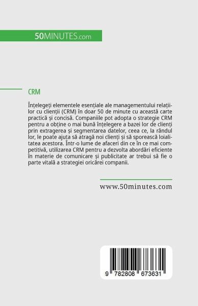 În¿elege¿i elementele esen¿iale ale managementului reläiilor cu clien¿ii (CRM) în doar 50 de minute cu aceast¿ carte practic¿ ¿i concis¿. Companiile pot adopta o strategie CRM pentru a ob¿ine o mai bun¿ în¿elegere a bazei lor de clien¿i prin extragerea ¿i segmentarea datelor, ceea ce, la rândul lor, le poate ajuta s¿ atrag¿ noi clien¿i ¿i s¿ sporeasc¿ loialitatea acestora. Într-o lume de afaceri din ce în ce mai competitiv¿, utilizarea CRM pentru a dezvolta abord¿ri eficiente în materie de comunicare ¿i publicitate ar trebui s¿ fie o parte vital¿ a strategiei oric¿rei companii. Aceast¿ carte ofer¿ o introducere util¿ în aplicäiile managementului reläiilor cu clien¿ii în achizi¿ia de clien¿i, dezvoltarea strategiilor de marketing ¿i optimizarea serviciilor pentru clien¿i. De asemenea, include cazuri practice, o discu¿ie despre neajunsurile instrumentului, inclusiv despre costurile sale poten¿iale, ¿i o introducere în modele conexe, cum ar fi CRM social, managementul reläiilor cu furnizorii ¿i managementul reläiilor cu angajäii.